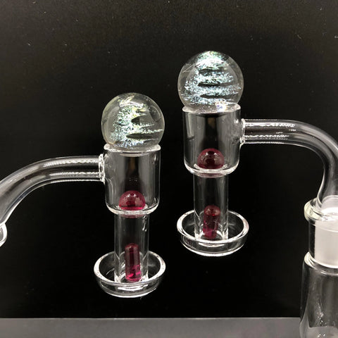 In place of carb caps, this style of banger uses a set of marbles. Different configurations of marbled exist for different variations of terp slurpers, but the most common type uses a large marble to seal the top of the banger, a medium marble to seal the top of the banger’s column, and a small terp pearl which spins inside the column, thoroughly agitating and blending your concentrate. Terp Slurpers are designed for lower temperature dabs, and are more difficult to clean after use, making them a favorite among more experience dab users who don’t mind spending the extra time and money to keep a terp slurper running at top efficiency.