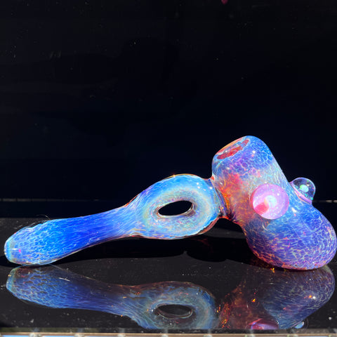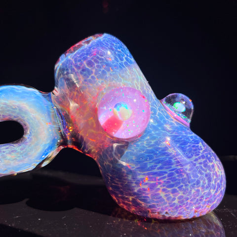 What started off as an amazing hammer idea quickly turned into a show stopping work of art with a donut along the mouth piece acting as an ash catcher, some added magnifying marbles containing opals, and even a featuring a horn with a carb made from telemagenta glass for an additional spark of color. The opals were also backed by the amazing telemagenta glass and fired off an array of rainbow colors as the light hit them just right.