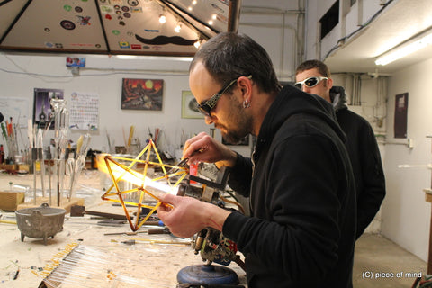 A self-described Gypsy Renaissance Warrior, Dosher has worked hard to balance the demands of modern living and glassmaking with his desire to live simply and focus on family, friends and good times. Dosh created a system maintain the delicate balance needed to maximize the creative flow needed to produce exquisite works of art, while constantly promoting maintaining an online presence, keeping track of inventory, updating websites, answering emails, restocking raw materials, all while keeping up-to-date on current trends. “I keep quotas, and make sure to always schedule time in to relax and enjoy life. Over the years I have had a best friend that has helped me immensely with the backend of running the business. Kendall and her husband CJ have been imperative in helping to create the website and online promotion, not to mention an enormous amount of moral support. I also have a strong network within the community and a wonderful family.
