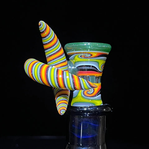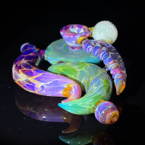 Jake C’s art is constantly changing and evolving, with the goal of constantly refining his purpose and finished products. A true creator, he gets bored making the same thing over and over.This drives his passion to constantly explore and mess around with new ideas, visions, and possibilities. For instance, check out his Leaf Amber Purple Pipe. This is an otherworldly design and only one was ever created! Organic in style and shape, with custom colors and really unbelievable detail work. If you’re after the headiest, this just may be the pipe for you!