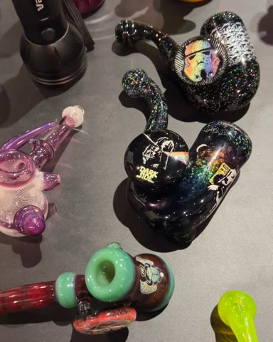 Our team at Tako Glass were itching to get texts from Tako with pictures of the unique pieces featured at the glass event, and were left waiting in anticipation to see what ones he would snag to bring back to the shop. Tako found loads of insanely cool colorful pipes, whimsical mushroom pieces, and even Star Wars themed Sherlocks! Keep your eyes out in the next few weeks for new drops promoting the latest glass arrivals to the Tako Glass workshop, www.takoglass.com/collections/new-arrivals.