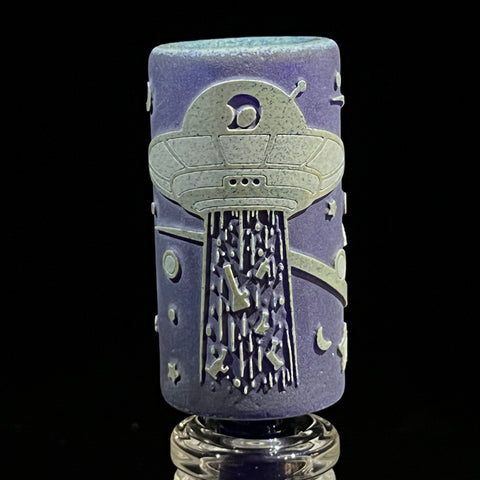The alien extraction pullslide, part of the Space Odyssey collection, shows a UFO in search of hidden treasure, beaming mini bongs and rigs down to earth and into the Tako Glass studio. The dark blue color makes the orbiting planet, stars and astroids really pop, drawing your attention to every last detail on this 4 inch pull slide. The Crystallized Dark Blue and Silver Frit Straight Tube comes with a sense of unknown featuring a textured criss crossed double layered sandblasted grip and a depiction of a heart, which is actually an upside-down bud. This bong includes an orbit bowl, stem, and even has an ice-restriction feature.