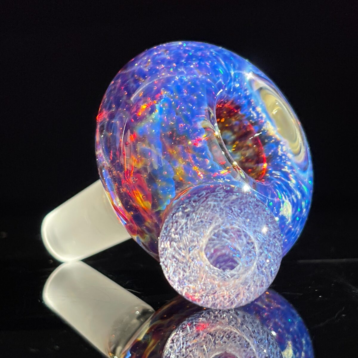 My new favorite glass technique, Space Dust, combined with my exclusive Purple Nebula effect. Space Dust is a ton of crushed opals tossed in to the mix, which creates a rainbow of sparkle against the fuzzy purple clouds. A large marble, filled with swirls of glittery dichro, sits on the side and acts as a handle. Thick, heavy, and full of BLING!