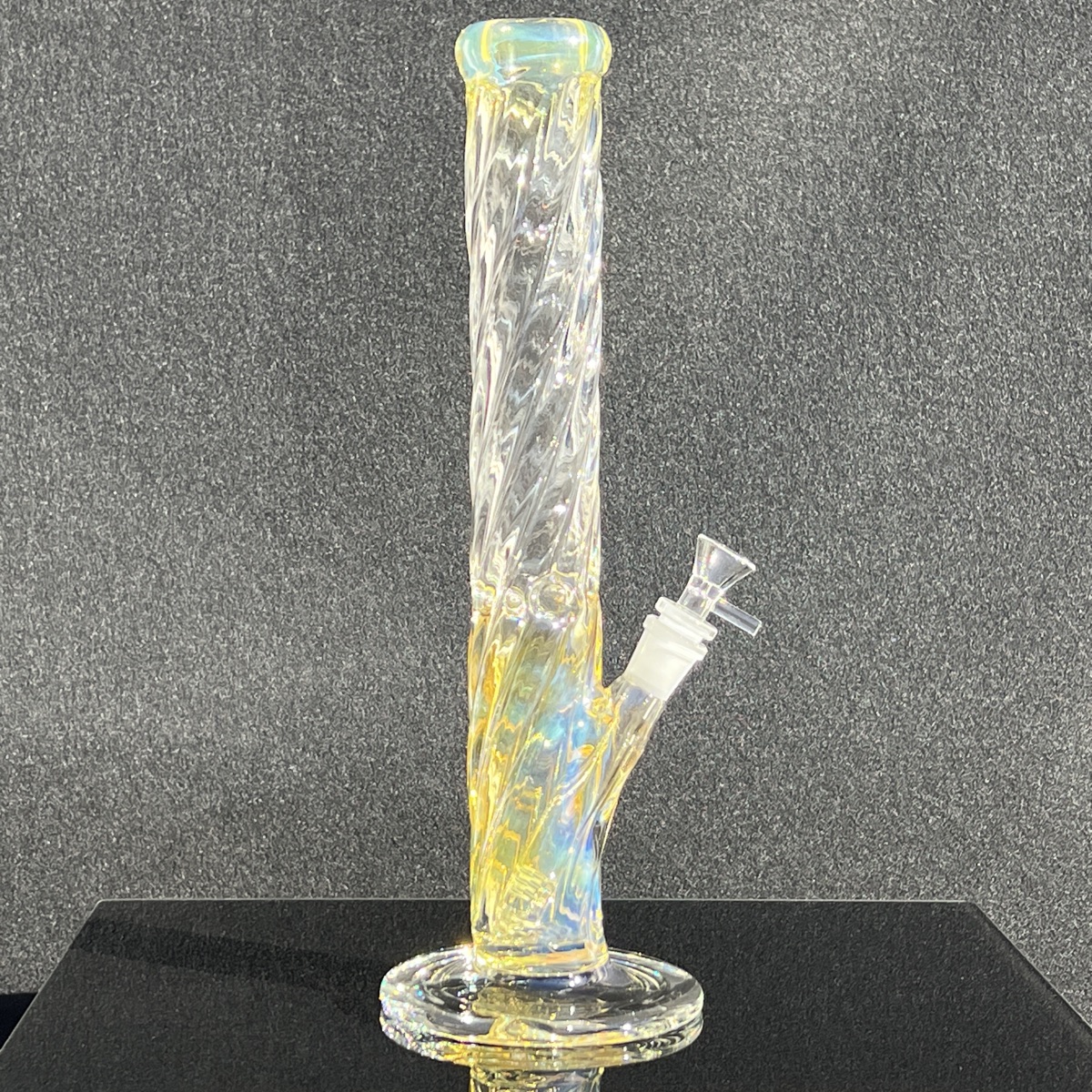 Made of trippy twisted 50×5 glass tubing, the scalloped twisting ridges and fume compliment each other, and together they make this pipe pop with golden hues, and capture a bunch of light!