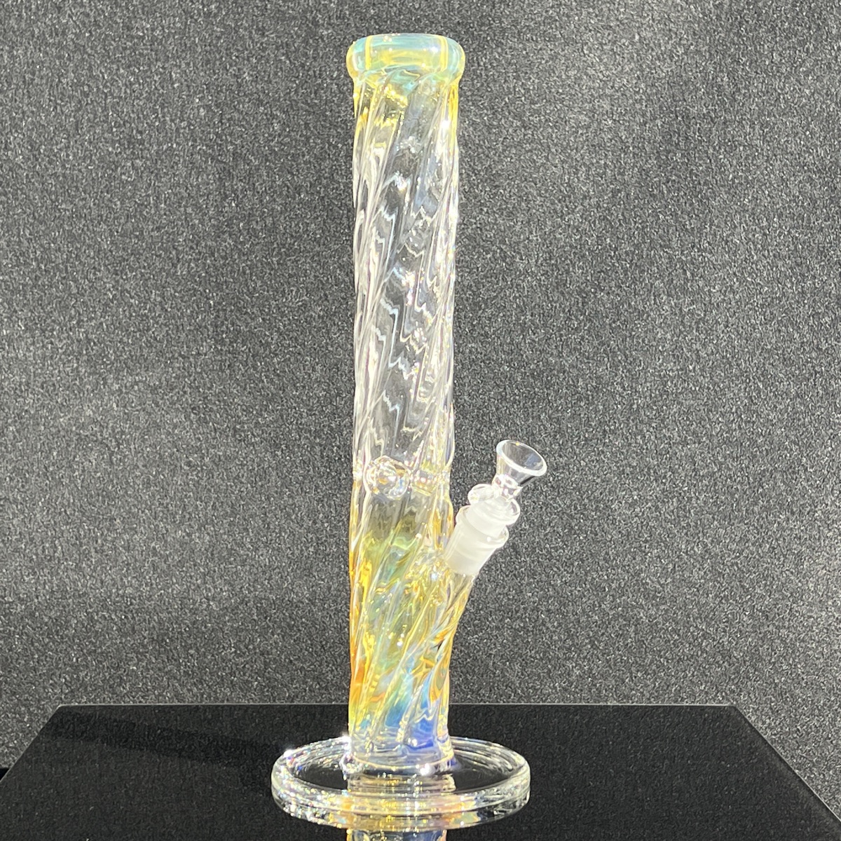 Made of trippy twisted 50×5 glass tubing, the scalloped twisting ridges and fume compliment each other, and together they make this pipe pop with golden hues, and capture a bunch of light!