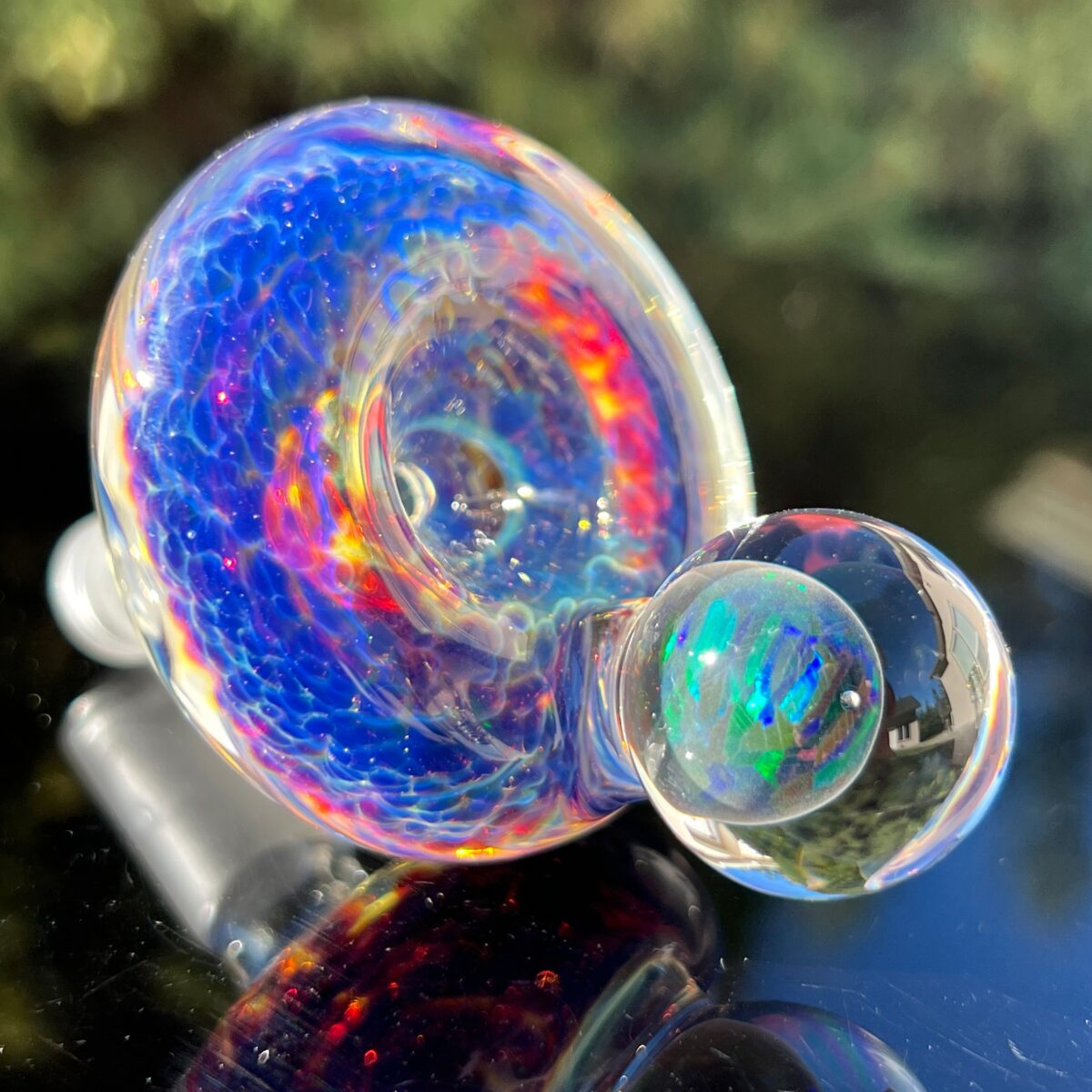 Rad purple pull slide in the nebula purples. Awesome opal sphere shines hella bright and vivid AND this is the largest opal planet out there! It’s super magnified with the marble it’s enclosed in, really sparking the colors that shine.