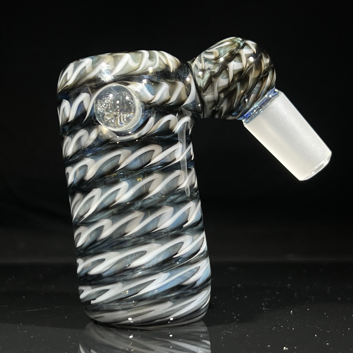 This percolating, ash catching pullslide is full of silver fume and swirling colors flowing throughout the piece. The awesome tie-dyed colors are one of my favorite details. The bowl is finger sized and is the perfect size to share with friends! It’s also super easy to replace the water and clean due to the large carb that has a removable clear marble!