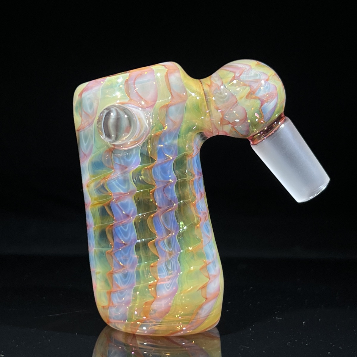 This percolating, ash catching pullslide is full of gold and silver fume with swirling colors flowing throughout the piece. The awesome tie-dyed colors are one of my favorite details. The bowl is finger sized and is the perfect size to share with friends! It’s also super easy to replace the water and clean due to the large carb that has a removable clear marble!