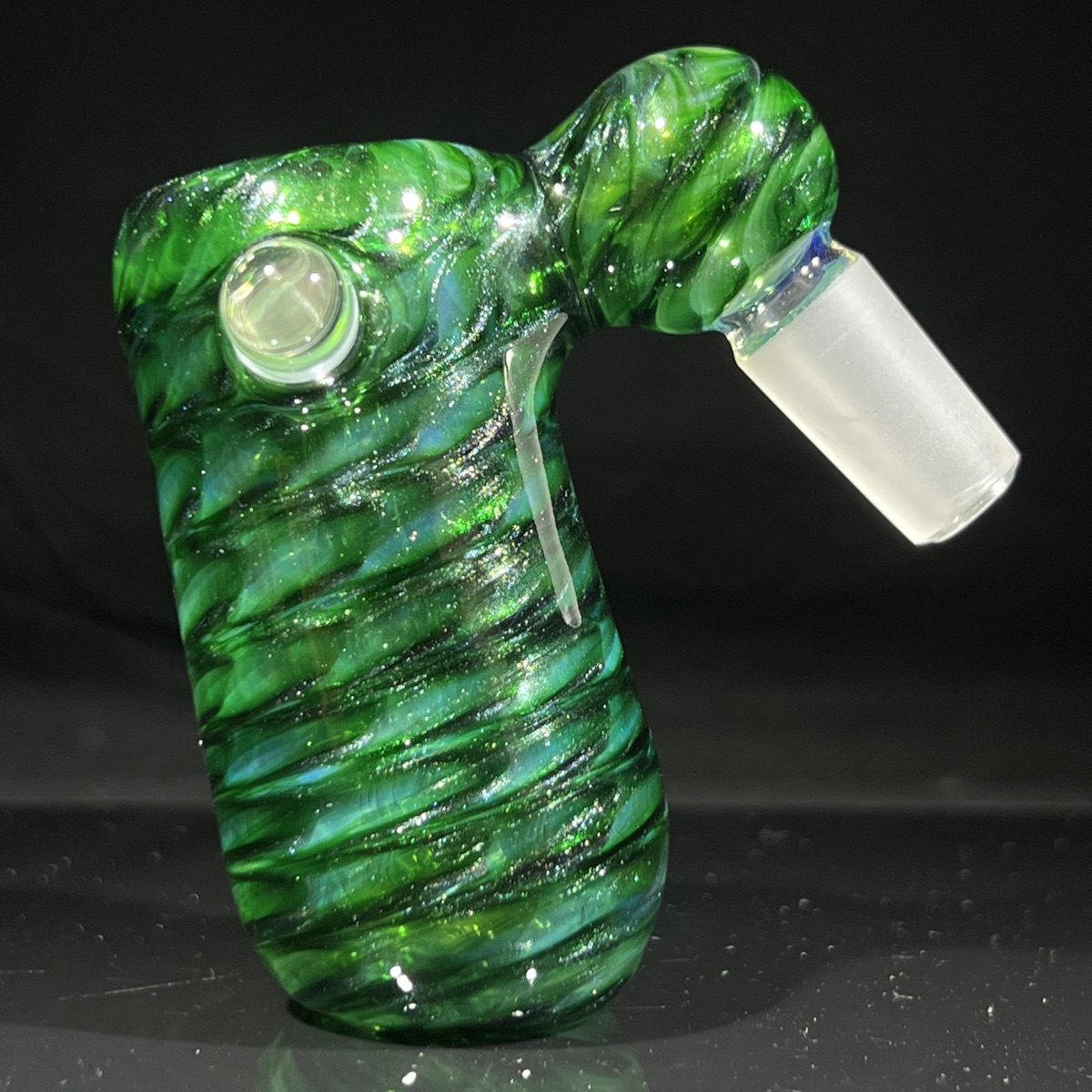 This percolating, ash catching pullslide is full of silver fume and swirling colors flowing throughout the piece. The awesome tie-dyed colors are one of my favorite details. The bowl is finger sized and is the perfect size to share with friends! It’s also super easy to replace the water and clean due to the large carb that has a removable clear marble!