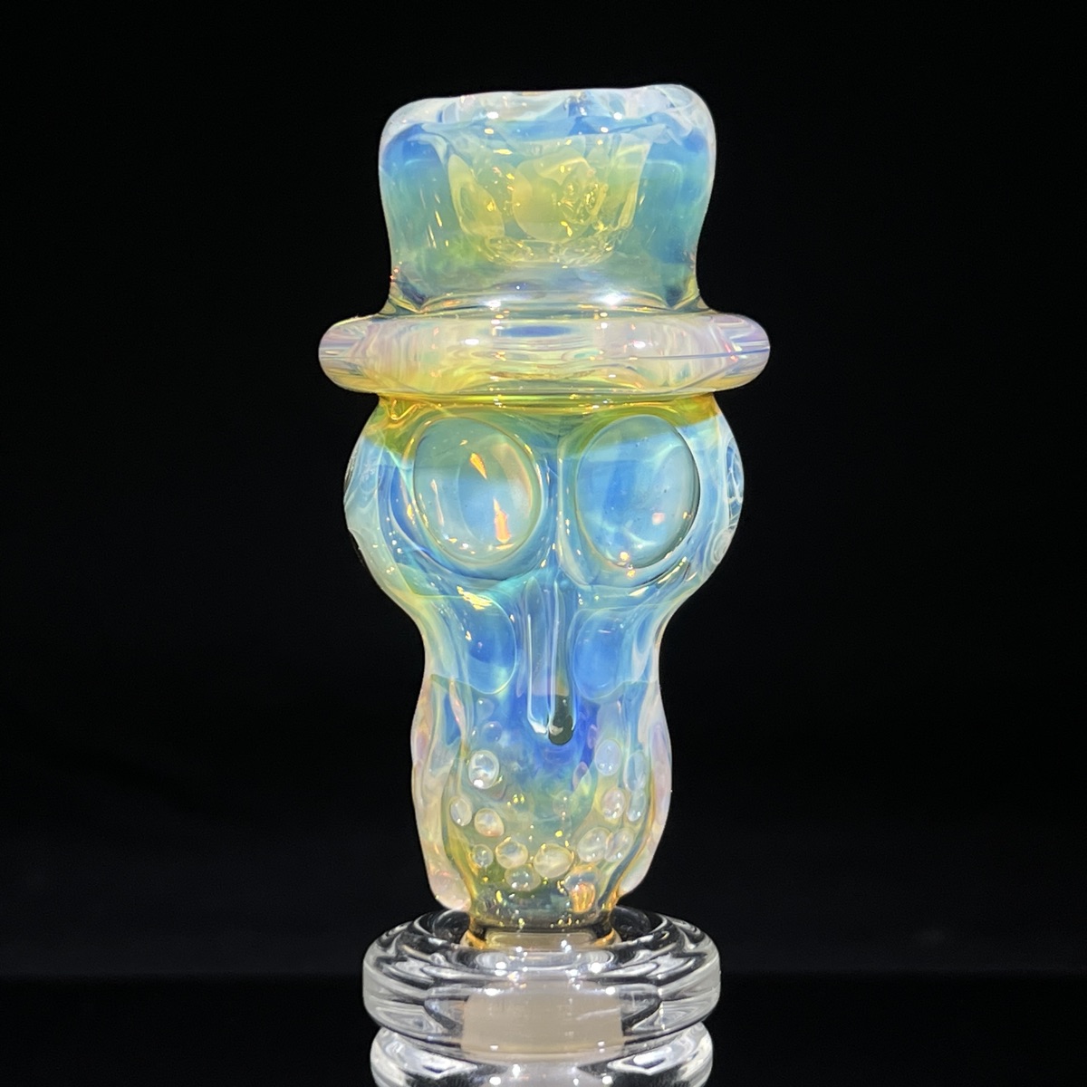 Travis Wigger is a skilled glassblower and a key member of the Snodgrass Family Glass collective, a group of artists mentored by or associated with Bob Snodgrass, the pioneering “Godfather of artistic hard glass” known for revolutionizing borosilicate pipe-making. Based in Eugene, Oregon, Wigger began apprenticing under Snodgrass in 1991, mastering the signature fumed glass techniques that create color-changing effects and intricate designs. His signature works, such as this Top Hat Bong are highly sought after by collectors!