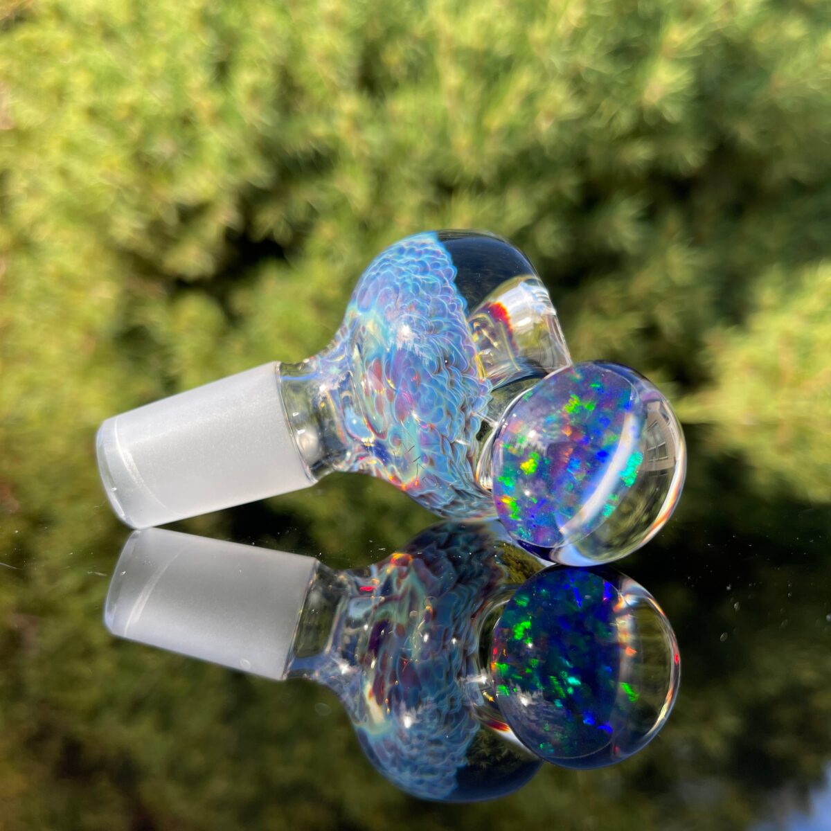 A gorgeous 18 mm pull slide with Tako’s exclusive purple clouds, color changing fume, and a huge, clear magnifying marble containing a MEGA opal disc that shines like the surface of the sun! Thick glass and sick colors, this thing is an eye-catcher! Words don’t do it justice, gotta check out the pics and vid!!!
