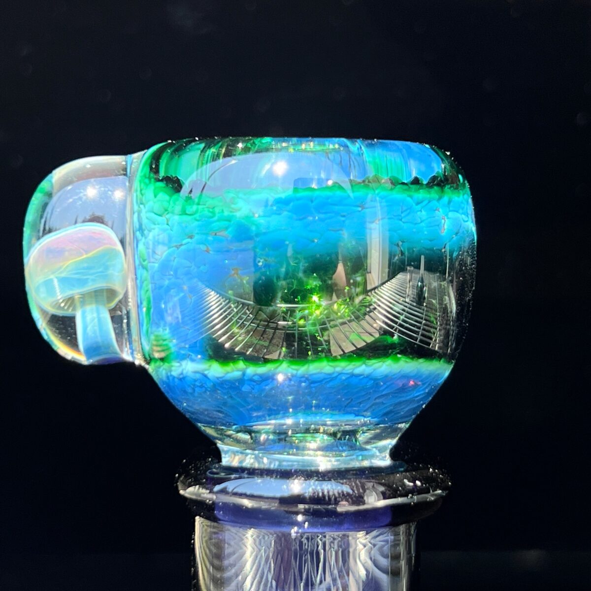We love the deep color in the 18 mm Experimental Green Mushroom PullSlide! Such a fantastic saturation of green, as if picked from the deepest jungle. The mushroom encased in a marble of glass really shines through with the sparkly background of the bowl.