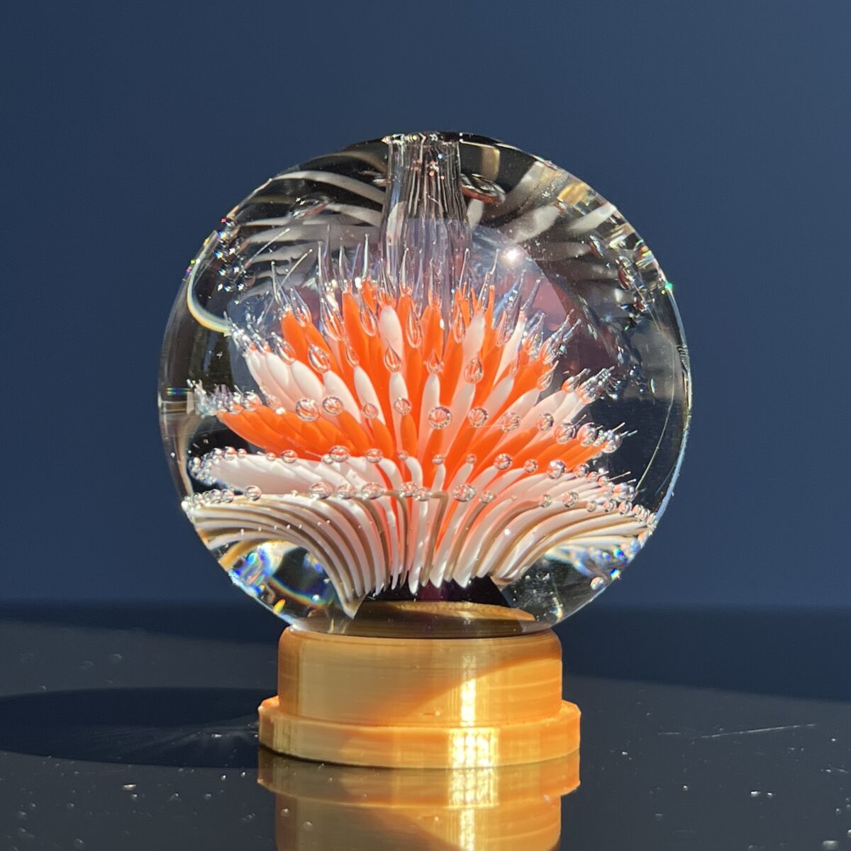 Check out this amazing Glass Anemone Marble Pipe!!! This is a just over two inch borosilicate marble. Super sturdy and so satisfying to hold in the palm of your hand! The anemone made of glass held within the marble is absolutely stunning and mesmerizing to look at. I could stare at this functional work of art for hours!