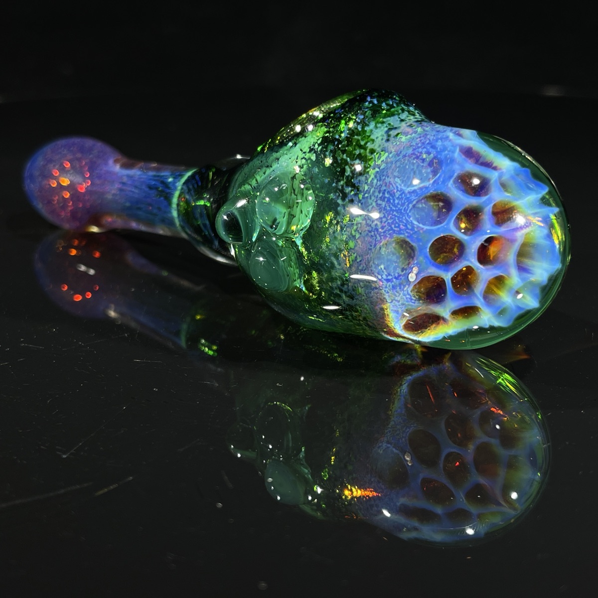 Honeycomb Frit Pipe looks good enough to eat! Lively indigo blues and a dash of fiery orange are featured throughout! These colors actually look juicy underneath that thick layer of clear glass. With a finger sized bowl and a nicely sized carb, this pipe will smoke great too! That big honeycomb head also makes for a super satisfying grip on the pipe, where all your fingers fit exactly where they need to be.