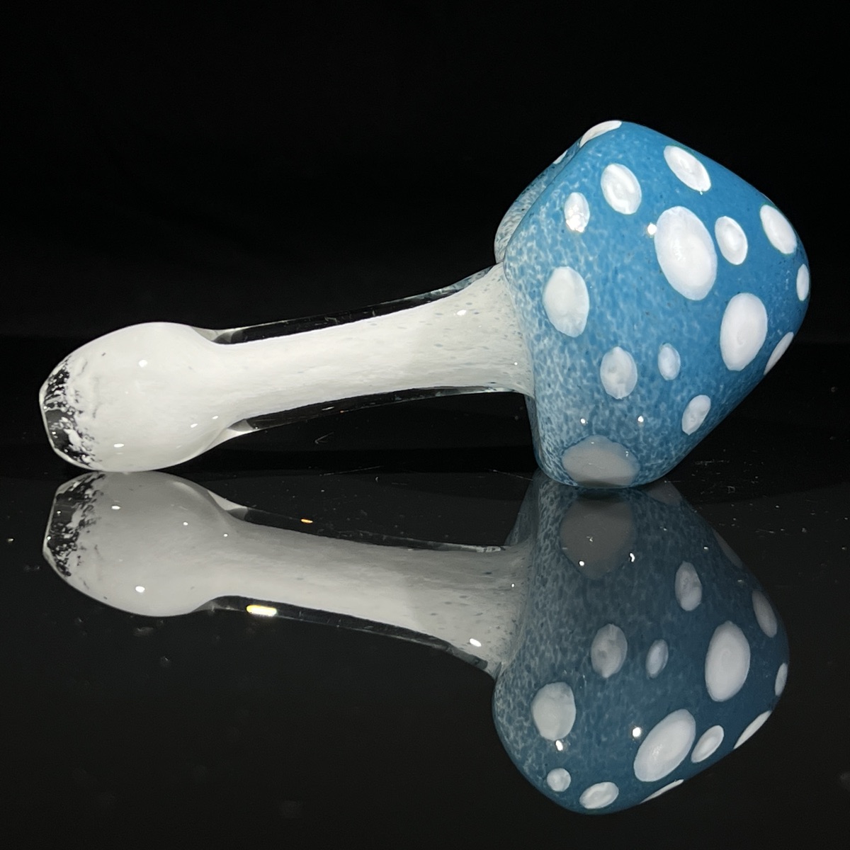 Shrink your fears with this Blue Mushroom Glass Pipe! This Blue Mushroom Glass Pipe is styled after an Amanita Muscaria, with its iconic colorful cap and white spots, as well as its long slender stem. This pipe has a deep finger sized bowl that you can load up with your favorite flower, though we don’t recommend throwing fireballs to light it! The left side features a large carb, placed well away from the bowl to keep your fingers safe and comfy. A flared round mouthpiece makes for a comfortable smoke, and helps give your fingers something to lock into for a solid grip.