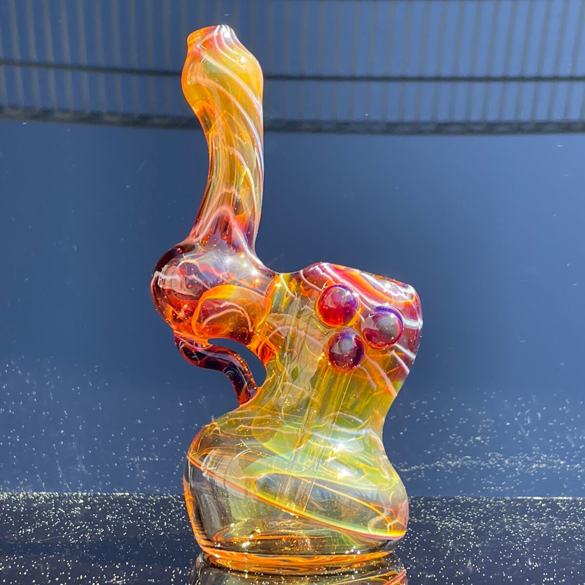 The color is radiant like a caramel colored sunset on the beach! Marbles on the glass are decorative and functional to keep your hand from slipping. Lastly the bridge on the stem connecting to the body adds a special beauty and strength. This piece really delivers on glass security.