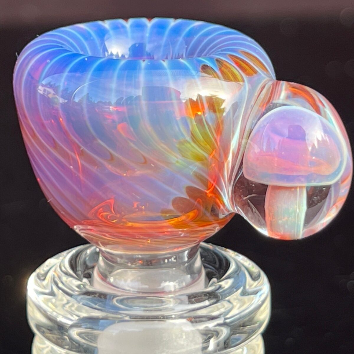 Getting down to mother nature with this Earthy Mushroom PullSilde. Natural colors throughout the pipe really enhance the mushrooms and marbles. What makes it extra special is that fuzzy mushroom within a marble. Almost like an opal!