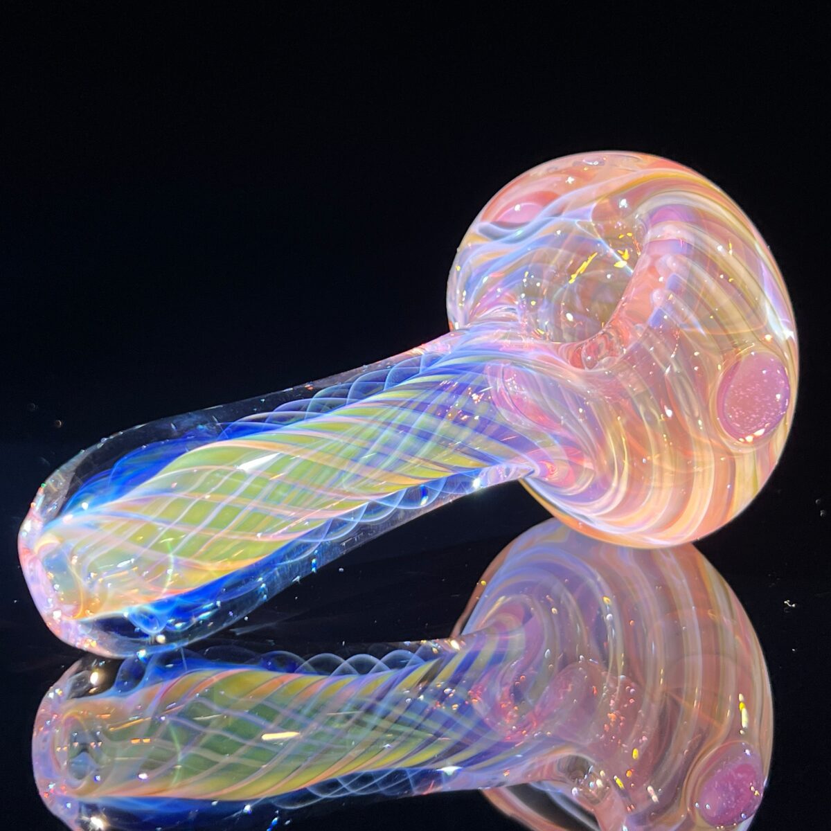 This thick glass fume pipe is chunky and sturdy. Perfect amount of 24K gold and pure silver are fumed to the inside of the glass to create a color changing wonder of colors. Clear glass is then laid in lines to trap the fume and then twisted to form the nice spiral vortex.