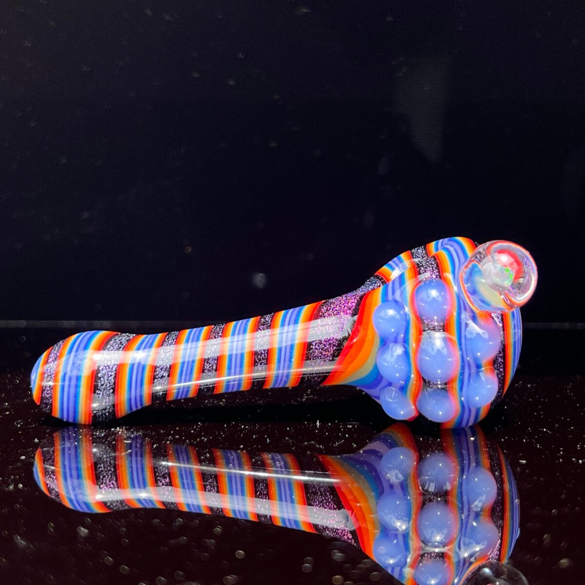 The Dichro Opal Marble Pipe is on another level! Rainbows swirl down the entire piece with dichro glittering in between rainbows. Blue marbles are intricately placed around the bowl giving it an amazing texture and added grip for when you’re loading your bowl. The marbles even match the reinforced carb to tie everything together just right.