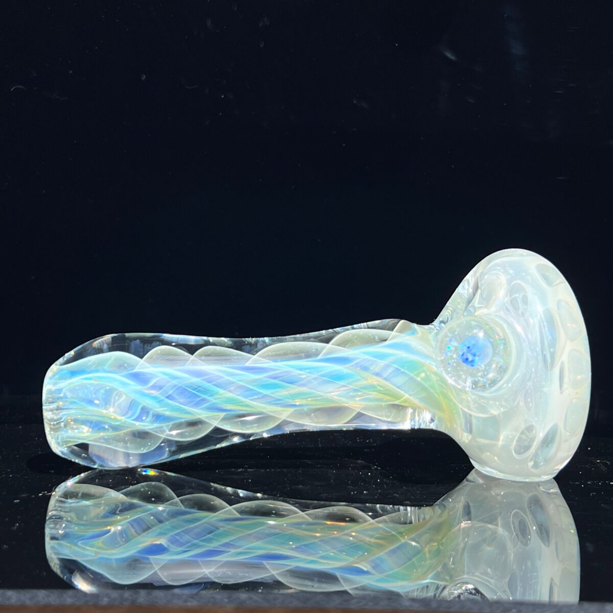 You will find it’s a super thick glass and has a really nice heavy weight to it. The more you smoke it, the more it will change color. From beautiful yellows to silvery, electric blues and everything in between.