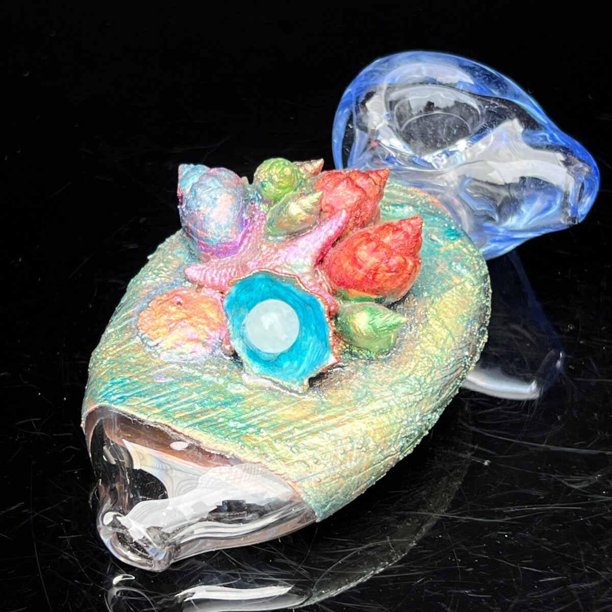 Cherry Glass is an American artist who produces high-quality hand blown glass. The Electro-formed Aquatic spoon pipe is one of the coolest glass pipes. There are REAL seashells and a starfish electro-formed in between the mouthpiece and glass bowl.