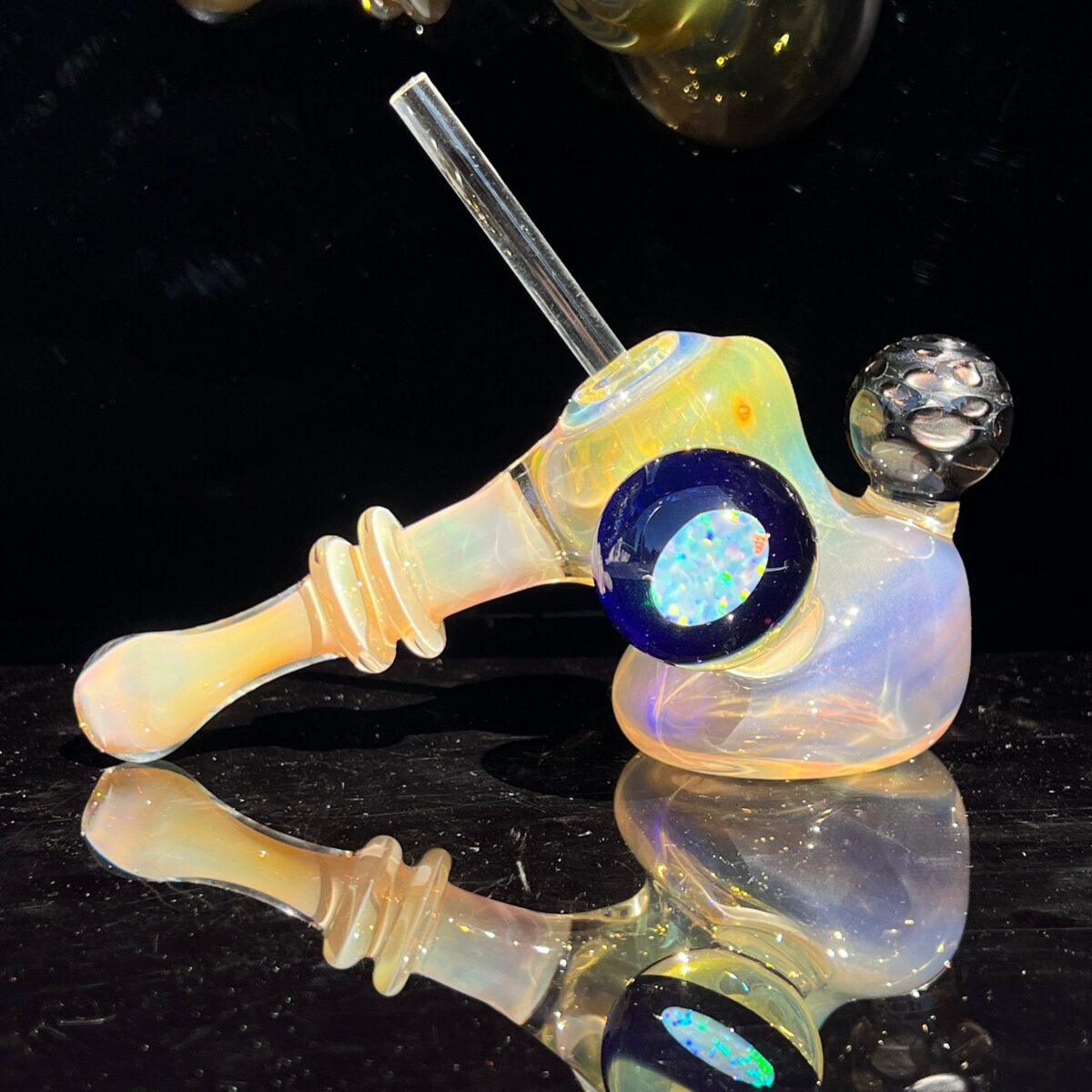 The Electrum Opal Hash Hammer is a special piece. Made with extra thich and heavy glass, this piece feels very substantial in your hand. Wide and squat base means it wont tip over after a session of smoking hash, although you might be fallin over. Humungus opal coin is backed with a beautiful cobalt blue and then placed ever so precisly in a huge marble. So fun to look at. I feel its like staring into the sun, so many layers of opal fire to look at, I love it.