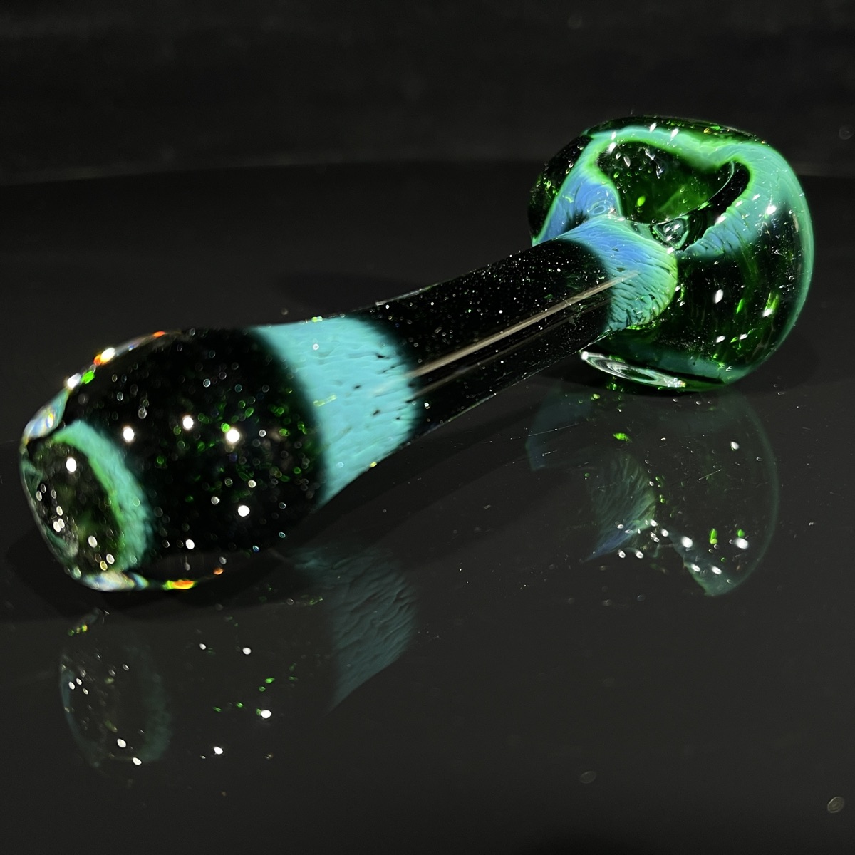 This Experimental Jade Spoon Pipe is like holding a piece of the lush Hawaiian rainforest in your hand! Beezy uses a technique called fritting to create this rad green color. Fritting is like sprinkling magical stardust on the glass, giving it a textured and earthy look.