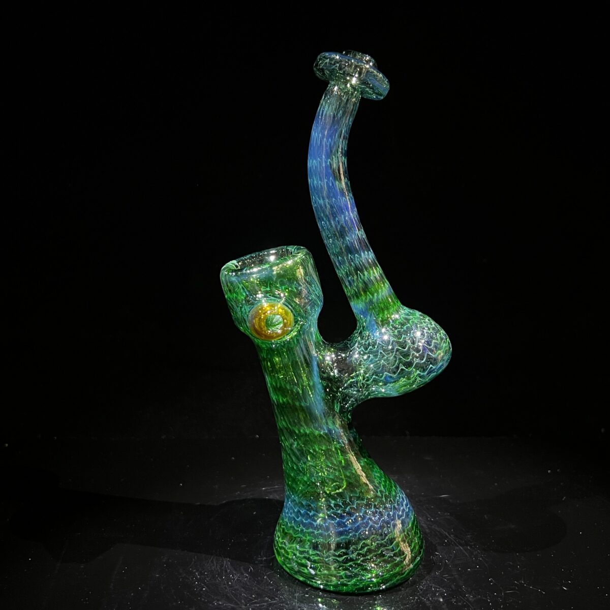 This gorgeous green patterned glass bubbler is the perfect on the go water pipe! The flat base allows it to stand comfortably yet fits great in hand, so it’s super comfortable to hold.