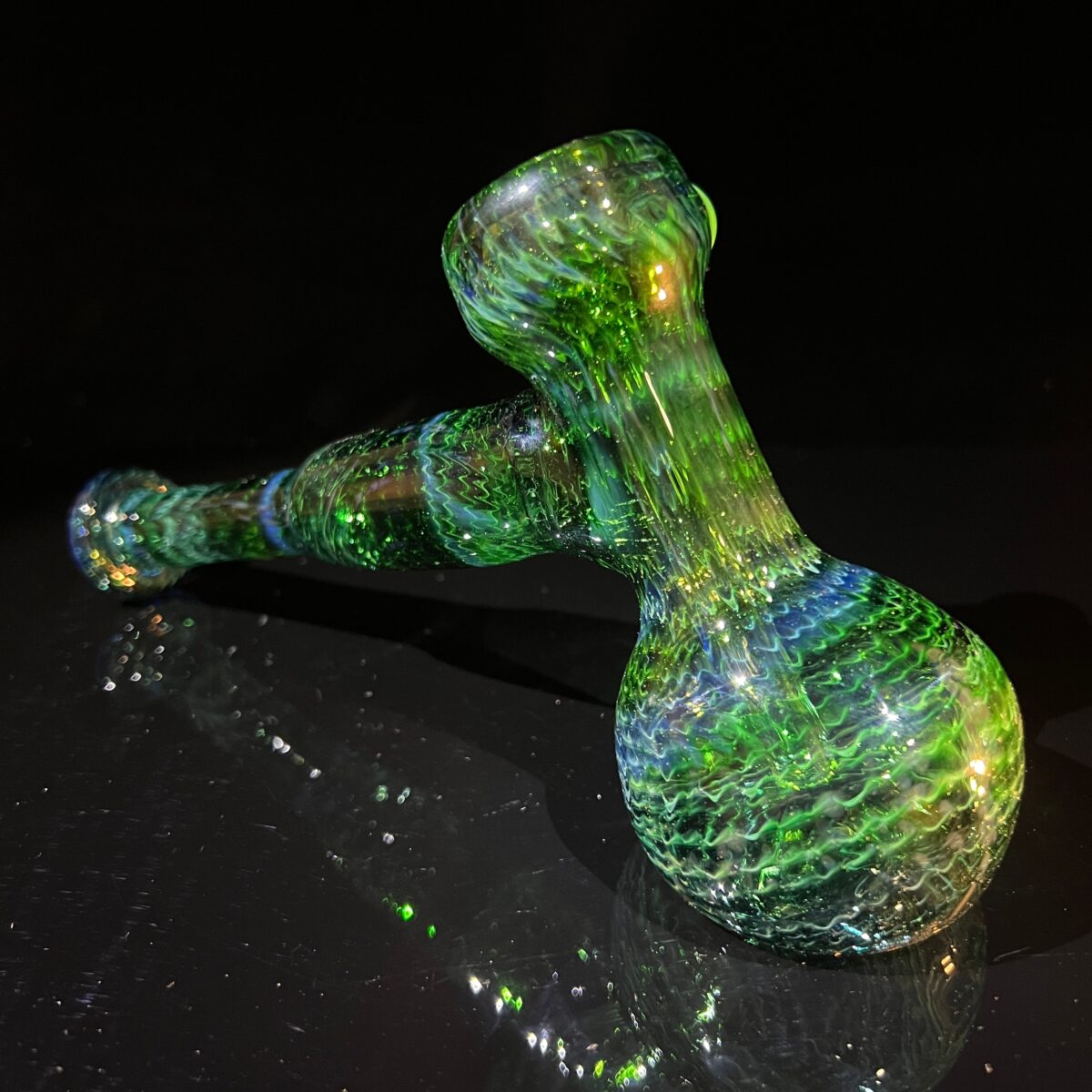 This rich green colored patterned glass bubbler hammer is such a sick new addition to our Cose glass inventory! The hammer bubbler has a flat base which allows it to solidly stand comfortably yet fits great in hand, so it’s super comfortable to hold. Best benefit of the bubbler is that it filters the smoke through water before it reaches your lips, making it taste amazzzinngggg! Thick and chunky with a fat bowl, and super durable, so it won’t shatter easily.