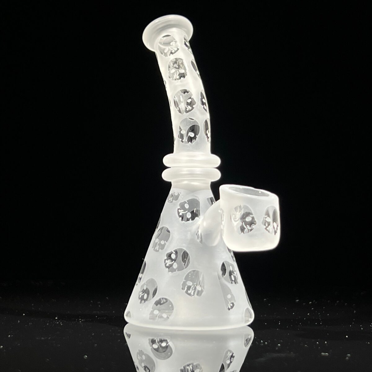 See the subtle luster of this Frosted Skulls Quartz Mini Rig. This beaker rig is made entirely out of quartz, making it more sturdy than its glass counterpart, borosilicate glass. This piece has no moving parts and is small, so it’s a perfect little addition to your travel bag. You may have seen similar rigs to these, but these have a frosted skull pattern that covers the whole piece and adds a touch of grit to these portable rigs.