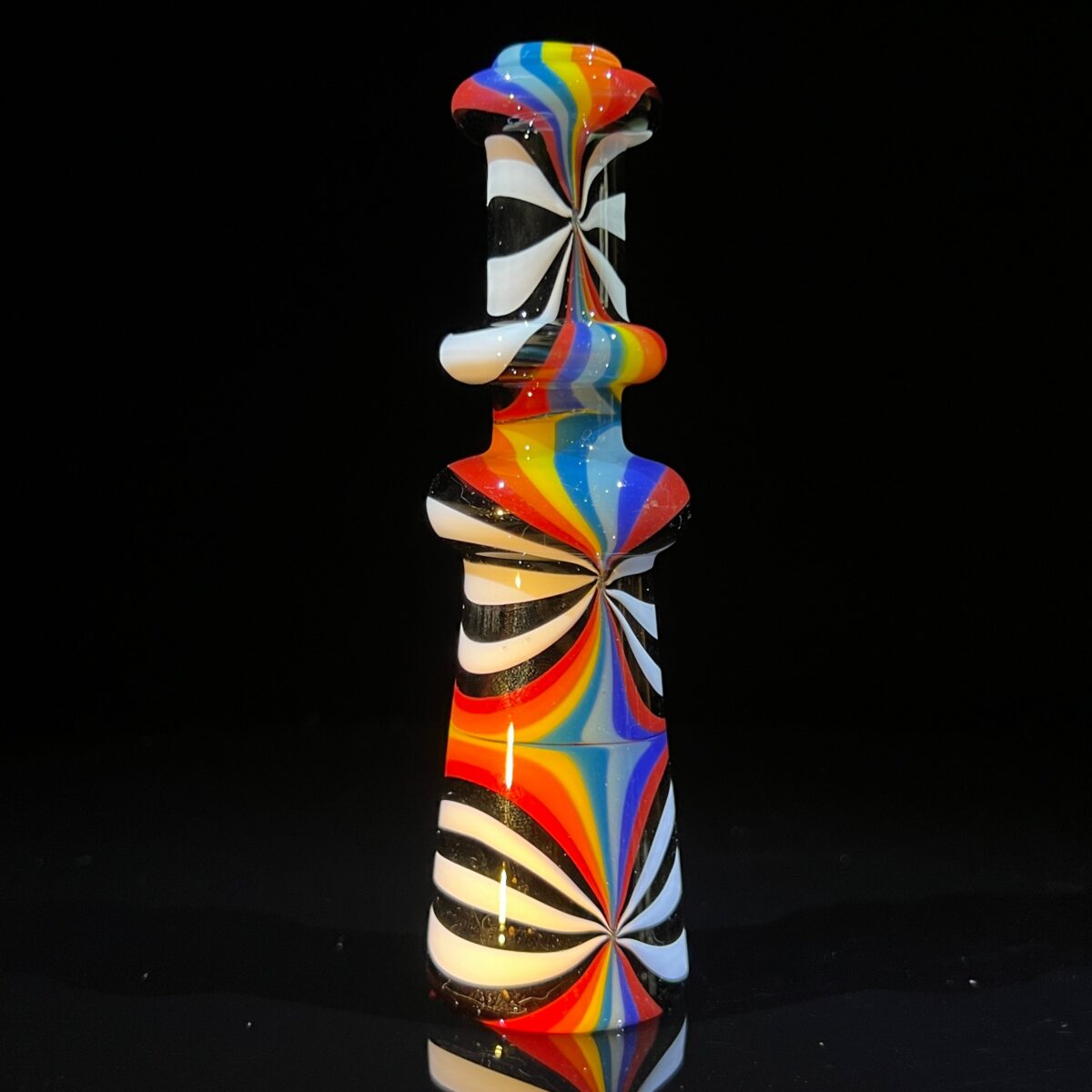 Get lost within the colors and shapes of this Heady Beachball Chillum 2 Chillum. So many bright, contrasting colors along with a bursting rainbow, this chillum really makes it as enjoyable as a day at the beach! The glass patterns are arranged in a technique called “Beachball”. None of the lines are wigged or wagged and just kept straight. So simple and yet so difficlt to pull of clean.