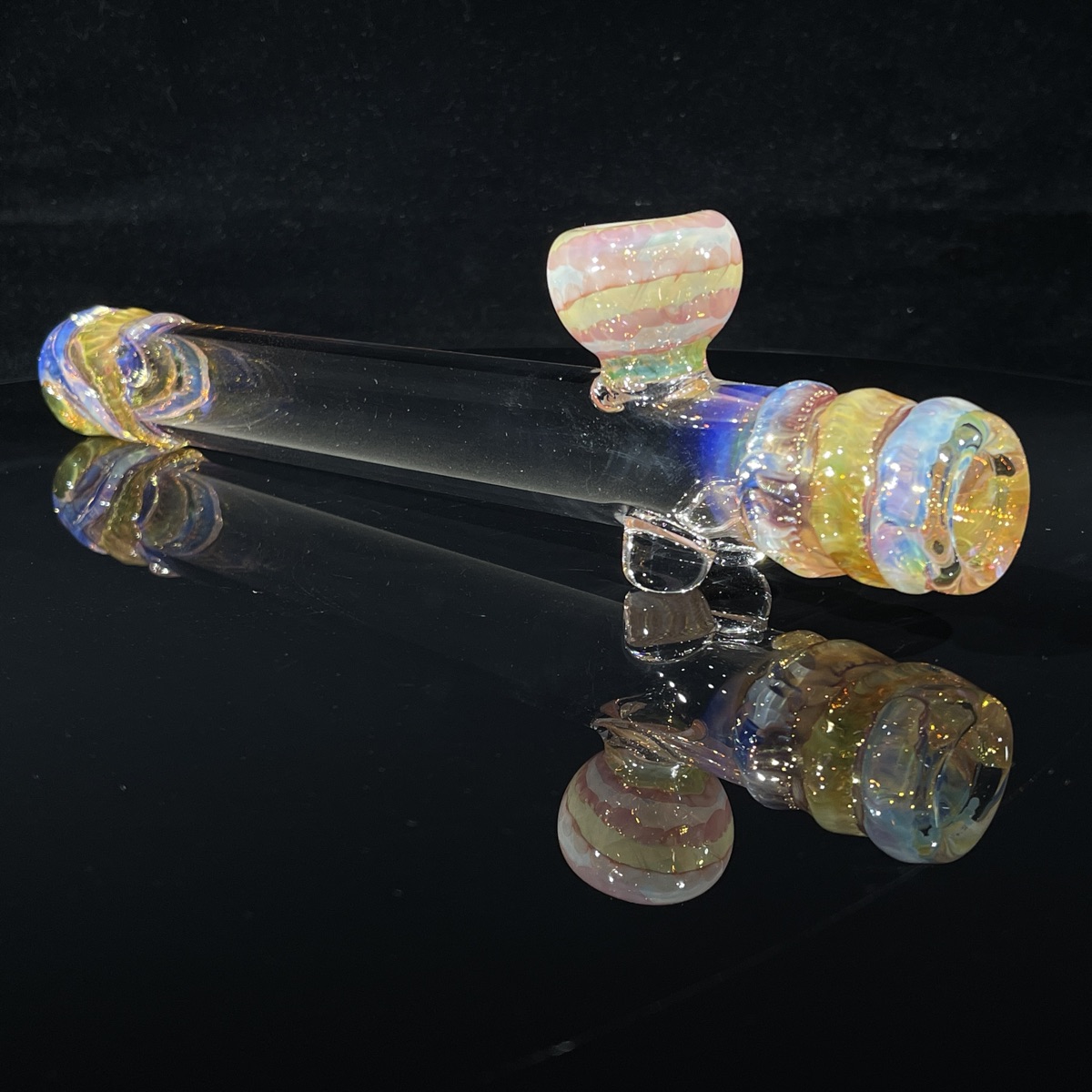 Starting at the mouth, it has gold fumed with a cool snake like swirl around both ends. The awesome tie-dyed colors are also around the end where you put your hand. There are two marbles on the bottom that help with stabilizing. The bowl sits on top of the marbles and matches so beautiful with the wrap around snakes on the roller.