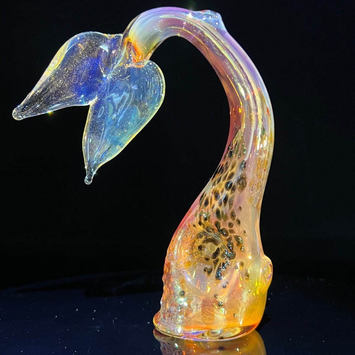 Dive into your own realm with this Mermaid Tail Pipe. Handcrafted, making each piece unique and one of a kind. This majestic pipe can easily blend in as a decoration, but will also look super sick when smoking out of it. These pieces will color change the more you use them.