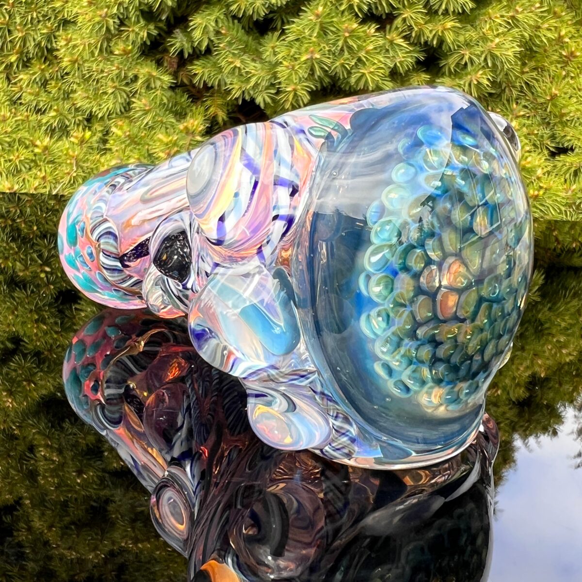 Thick and twisted pipe is just full of twisty cane and ribbons of dichro! It’s a nice and heavy piece with some super thick glass in a palm sized package. The stem holds a funky twist lined with magnifying marbles. It has a pinched mouthpiece on one side and some wicked honeycomb pattern on the other side. Even reminds me of a lotus seed making it a truly unique piece. Bonus points for how stellar it looks under the UV light!