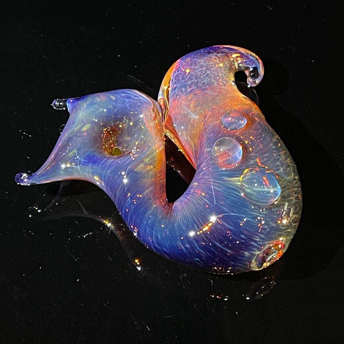 The organic shape curls perfectly in your hand with delicate swirls cresting the edges like waves. The fume technique used only heightens the magical feel of this pipe, as the colors change and burst with every smoke session. The three marbles on the top make it feel nice in your hand and add to the whimsical shapes and features of this pipe.