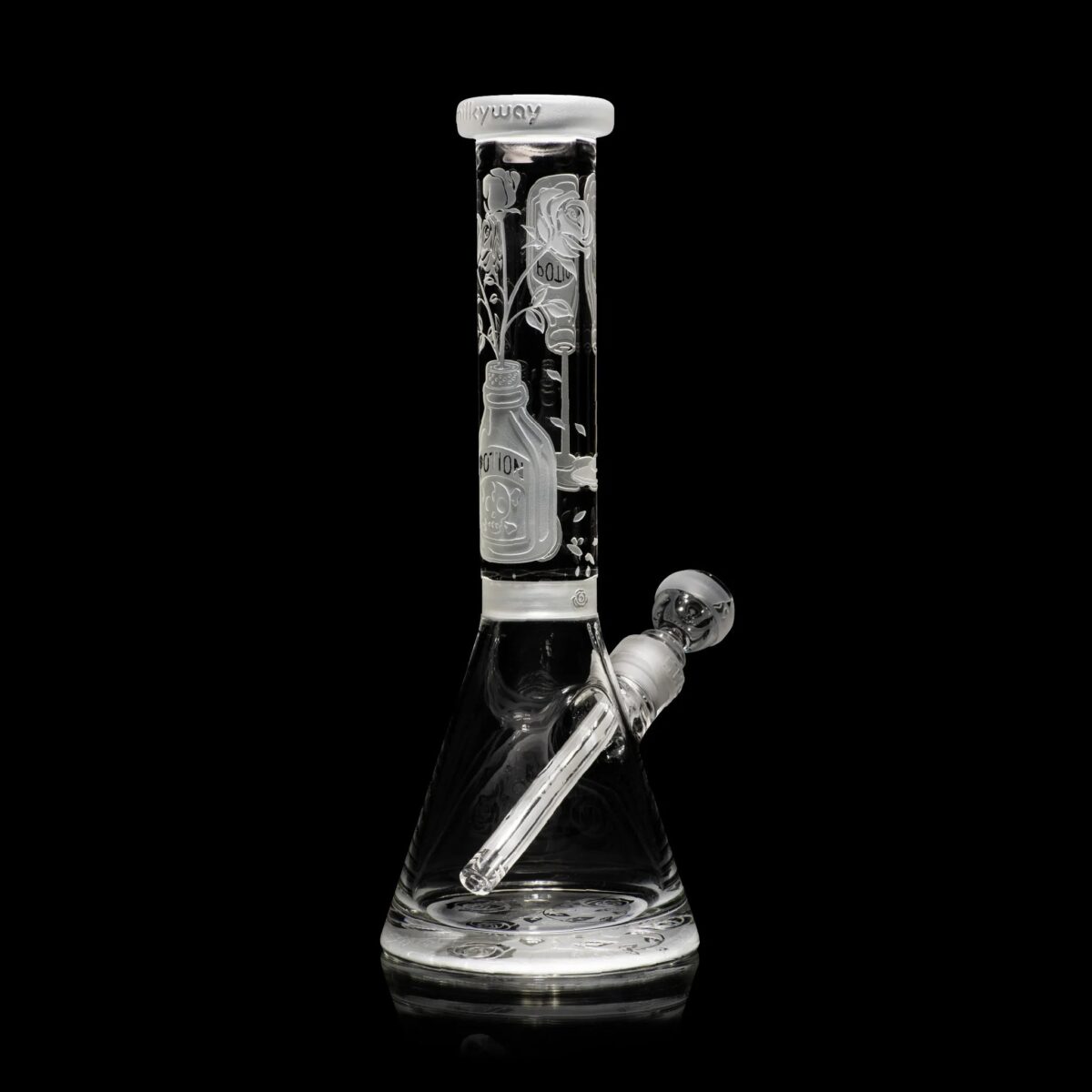 Anything can grow in the right conditions, including roses from unspecified dark potions… This 14” beaker walks poetic lines in its depictions of deeply sandblasted roses on the tube and base.
