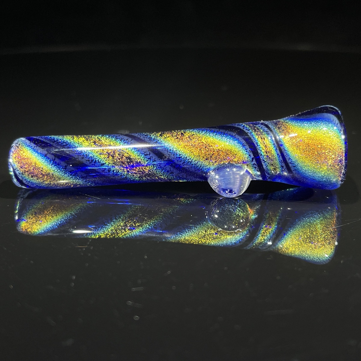 Check out this Proud Peacock Dichro Chillum! A colorful, vibrant strip of dichroic glass spirals from the mouthpiece to the bowl, on a background of deep blue glass reminiscent of the iridescent plumage of a peacock. A small marble sits by the bowl providing a great finger rest and keeping your chillum from rolling away. Compact and discrete, this piece is perfect for on the go rips when time is of the essence.