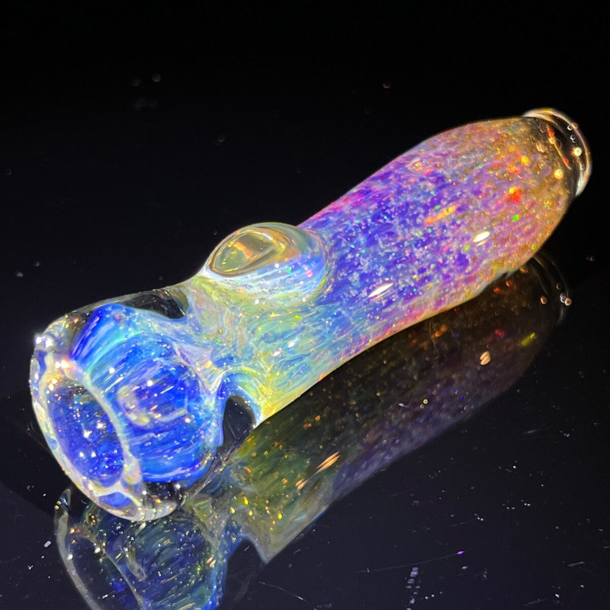 The crushed opal has a luxurious array of mini stars floating through the nebula. Every angle gets you a sparkly touch of rainbow. The pipe itself is a color changer, so the more you use it, the cooler it will look! Its colors are going to change into a bright purple with electric blues!