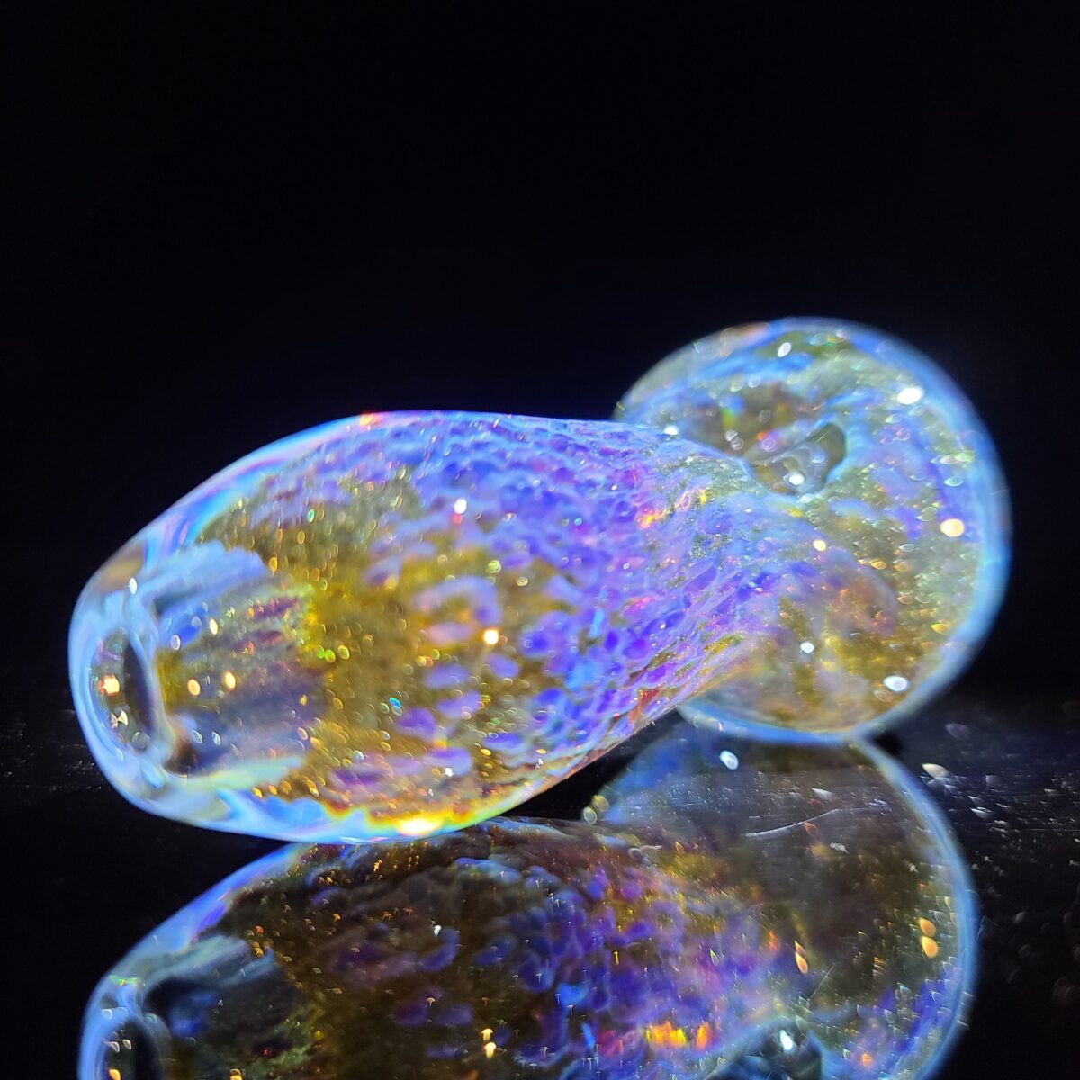This frit spoon is a thick glass pipe with my exclusive fuzzy purple clouds, a splash of glittery green moss, and is small enough to slip into a pocket! It is a color changer, so the more you use it, the cooler it will look. Its colors are going to change into a bright purple with electric blues!