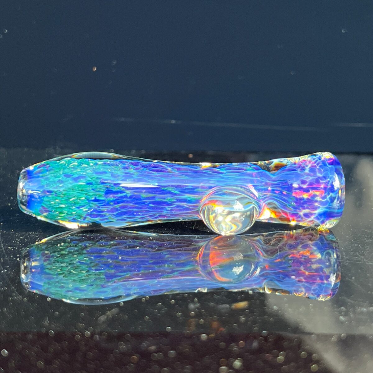 A perfect pocket pipe, this frit chillum is a thick glass piece with Tako’s exclusive fuzzy purple clouds. A clear marble sits on the side, magnifying the colors, textures, and sparkle.