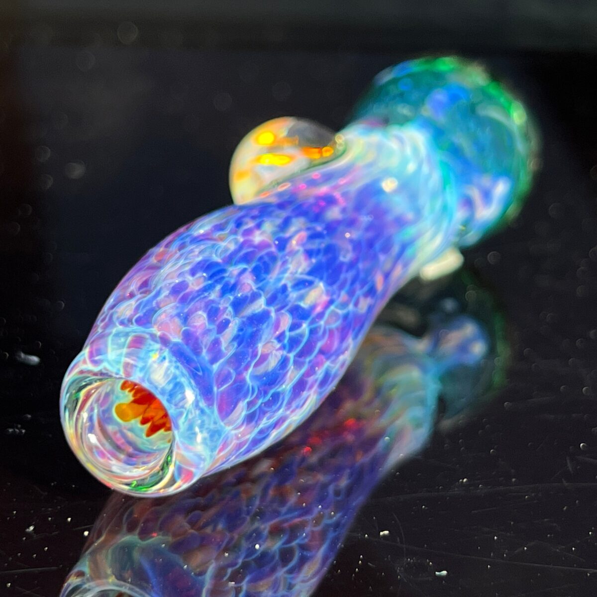 A perfect pocket pipe, this frit chillum is a thick glass piece with Tako’s exclusive fuzzy purple clouds. A clear marble sits on the side, magnifying the colors, textures, and sparkle.