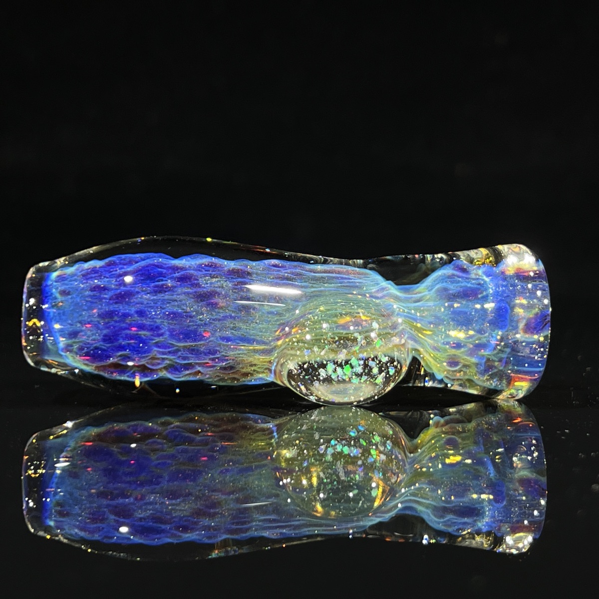 A perfect pocket pipe, this Purple Nebula Cropal Chillum is a thick piece with Tako’s exclusive fuzzy purple clouds. A clear marble sits on the side, magnifying the colors, textures, and sparkling crushed opals!