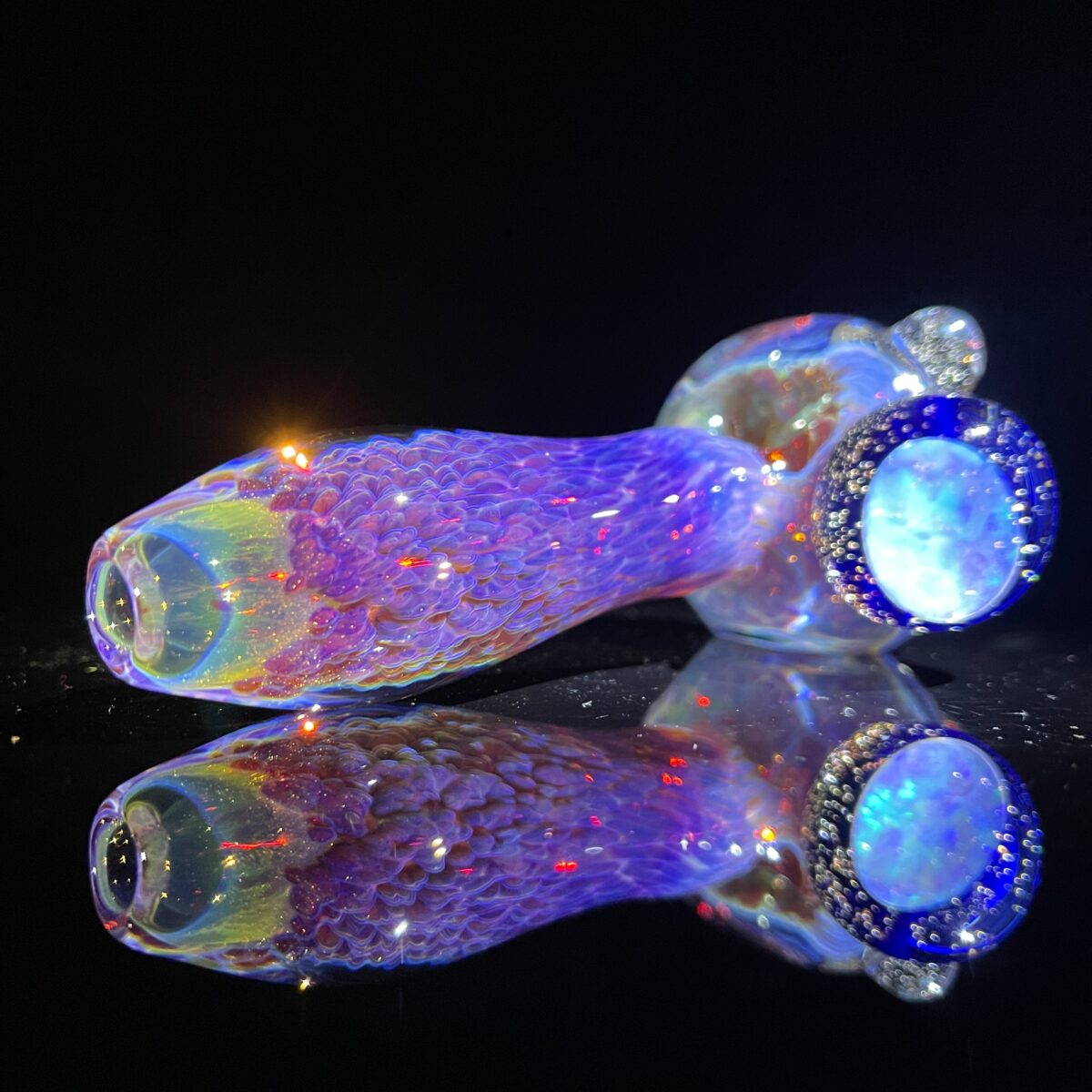 This is my original frit spoon pipe, with the thick glass and exclusive fuzzy clouds, but with a bunch of added marbles and a GIANT opal disc. Each of the four marbles reacts to UV light for that ultimate bling! It is a color changer, so the more you use it, the cooler it will look. Its colors are going to change into a bright purple with electric blues!