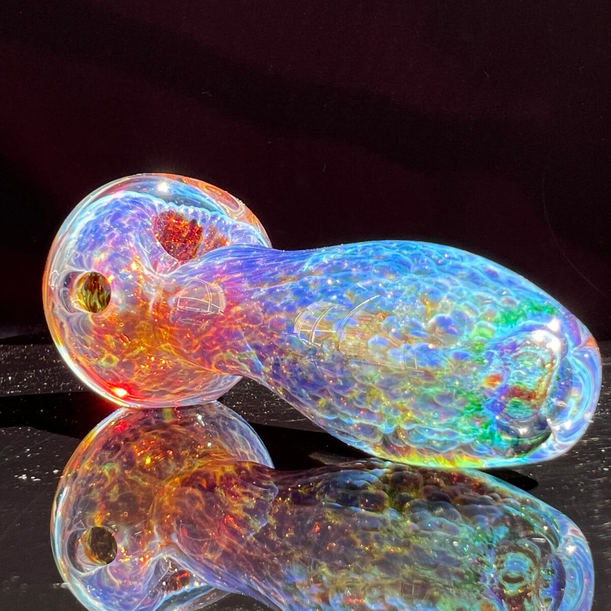 This frit spoon is a thick glass pipe with the fuzzy purple clouds space dust for ultimate bling! Everytime you shine light on the glass, it has little flashes of color sparkling. It is a color changer, so the more you use it, the cooler it will look. Its colors are going to change into a bright purple with electric blues!