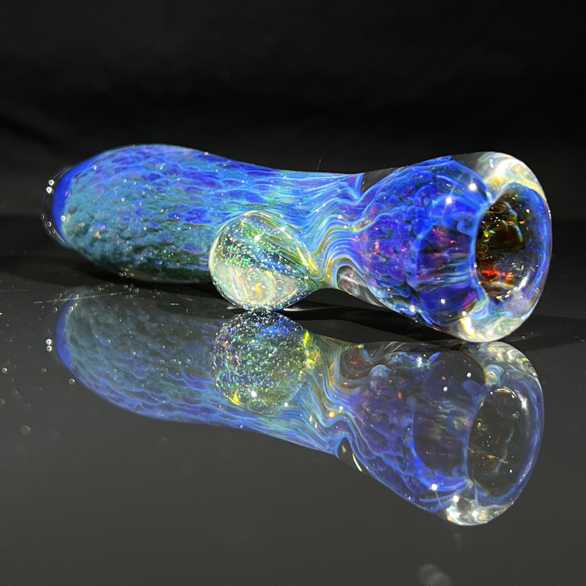 This piece is just going to get even better as it colors in with time and use. The magnifying marble is filled with glimmering crushed opals and will help give you an in depth look at spectrum of light being reflected in this piece. If you find yourself getting lost just staring at this piece, just know you’re in good company!
