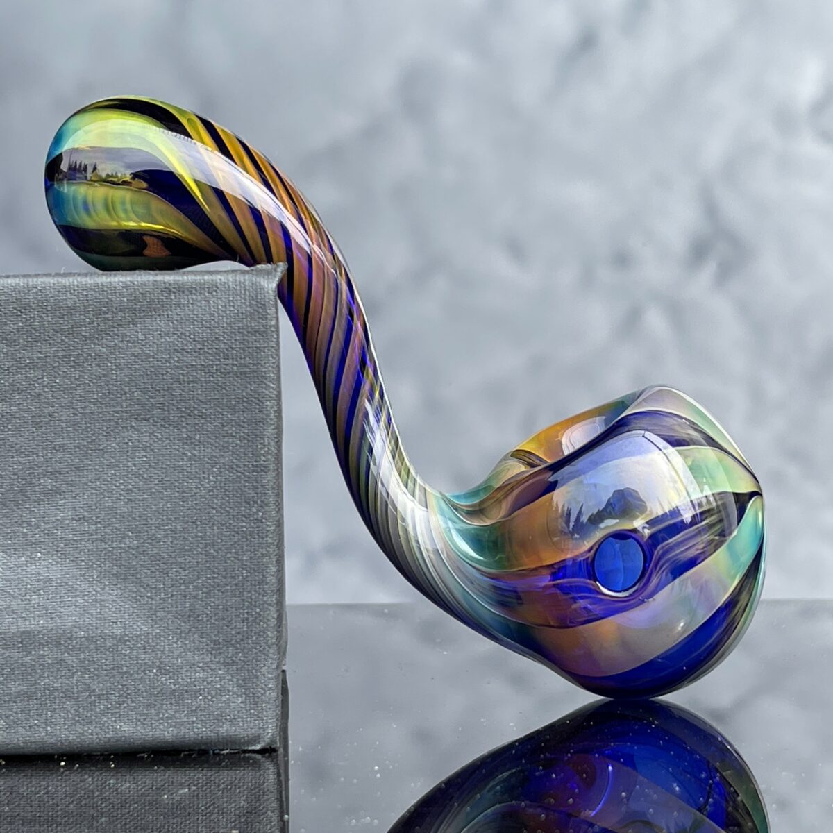 Fuming is a glass blowing technique in which blowers vaporize metals of silver, gold, or platinum in front of their flame. This releases fumes that travel up the flame and bind to the surface of the glass. These metals create a thin layer that reflects light and produces different colors depending on the angle and lighting conditions. So cool!!