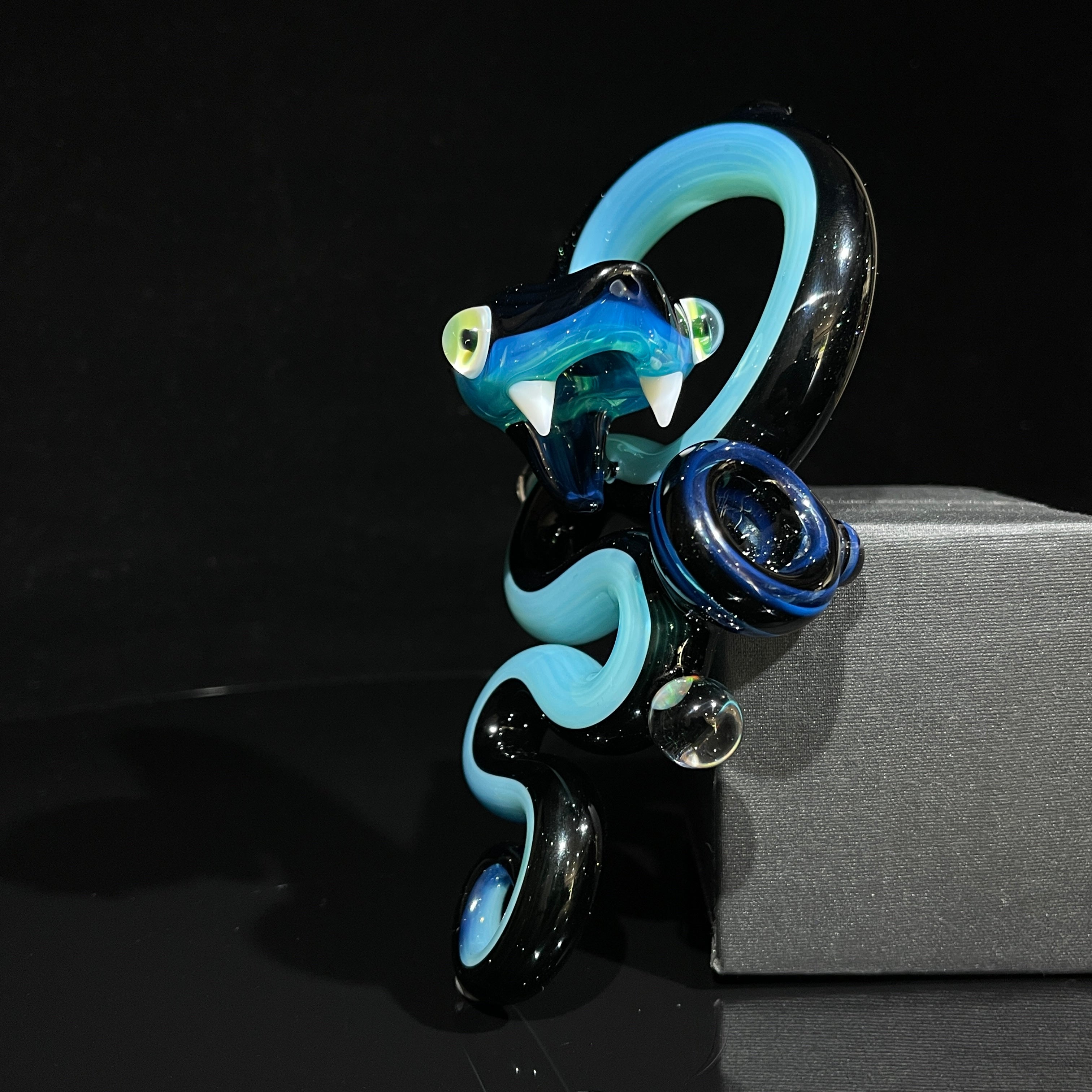 At first glance, Niko’s style is immediately recognizable, from the quirky character affect in the expression of the snake, and the smooth flow and taper in the slithering body, especially the subtle color fade from teal to blue. Even the black work has a ton of depth to it! Its full of subtle lines of sparkle, forming ghostly patterns in certain areas. This heady hand pipe is exquisitely crafted! Every detail has been laid and shaped with great care.