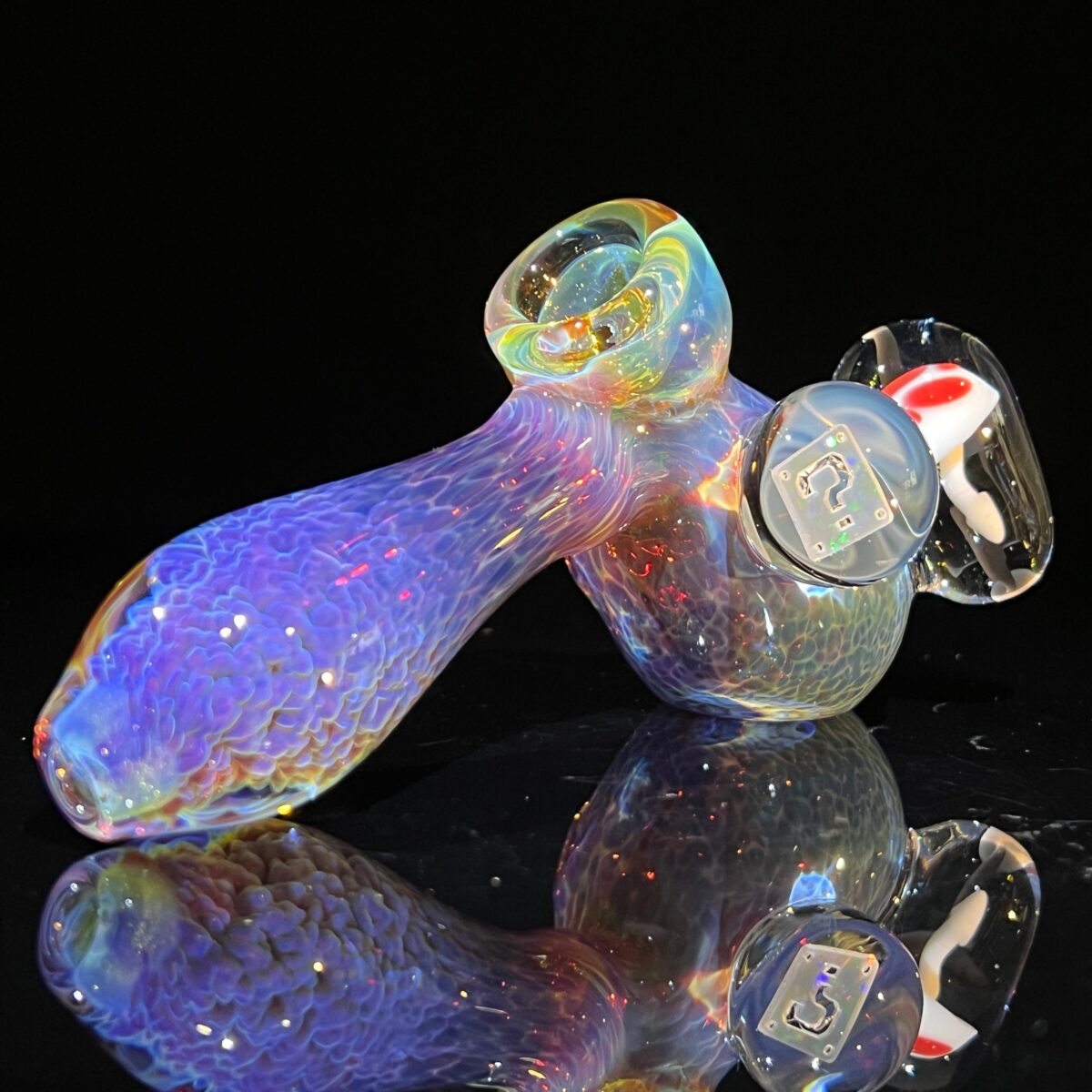 Inspired by the Super Mario brothers, this drop hammer is a thick glass pipe with my exclusive fuzzy purple clouds. It is a color changer, so the more you use it the cooler it will look. It’s colors will change into bright purple with electric blues! This sick pipe has three big marbles on the front which include a mushroom, question mark and a star. This piece is EPIC!