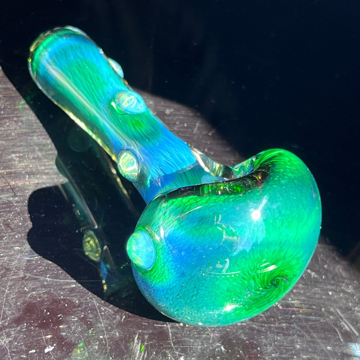 This pipe is a color changer so the more you use it the sweeter and more pronounced the colors will become. The piece also has some exciting fume coloring, so there will be accents of electric blue that will show up the more you use it.