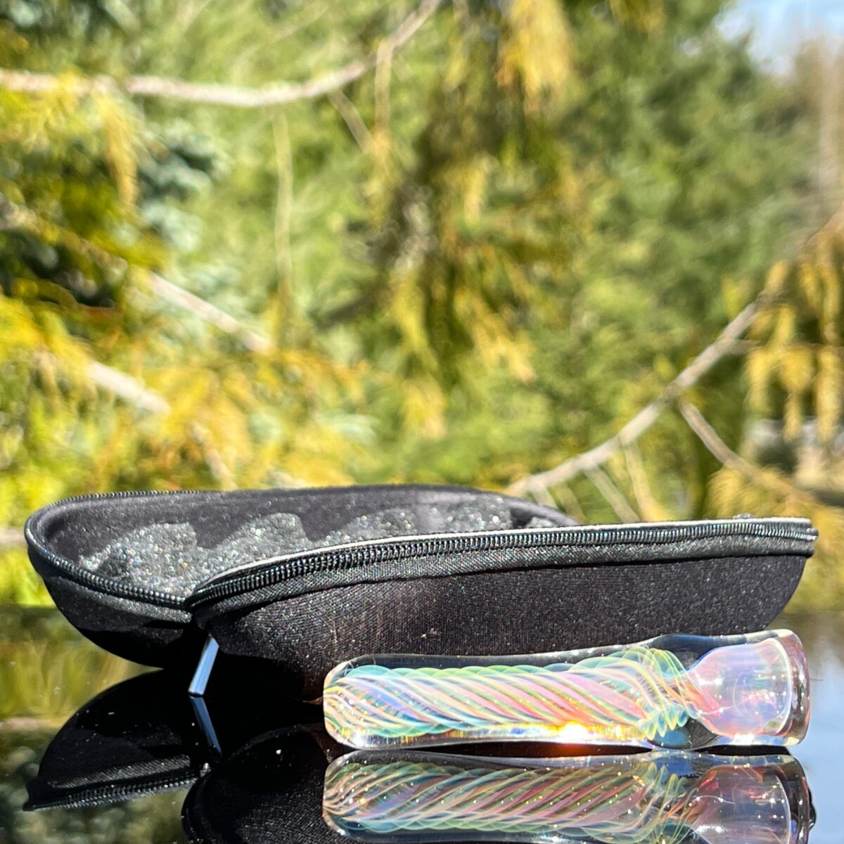 Includes a 6.5″ multi-color pipe case with internal padding to protect your glass, a zipper for easy access, and a clasp to attach it to your bag or belt loop. This bag is sleek and compact, with a pop of color, it’s the perfect way to protect and transport your favorite pieces!